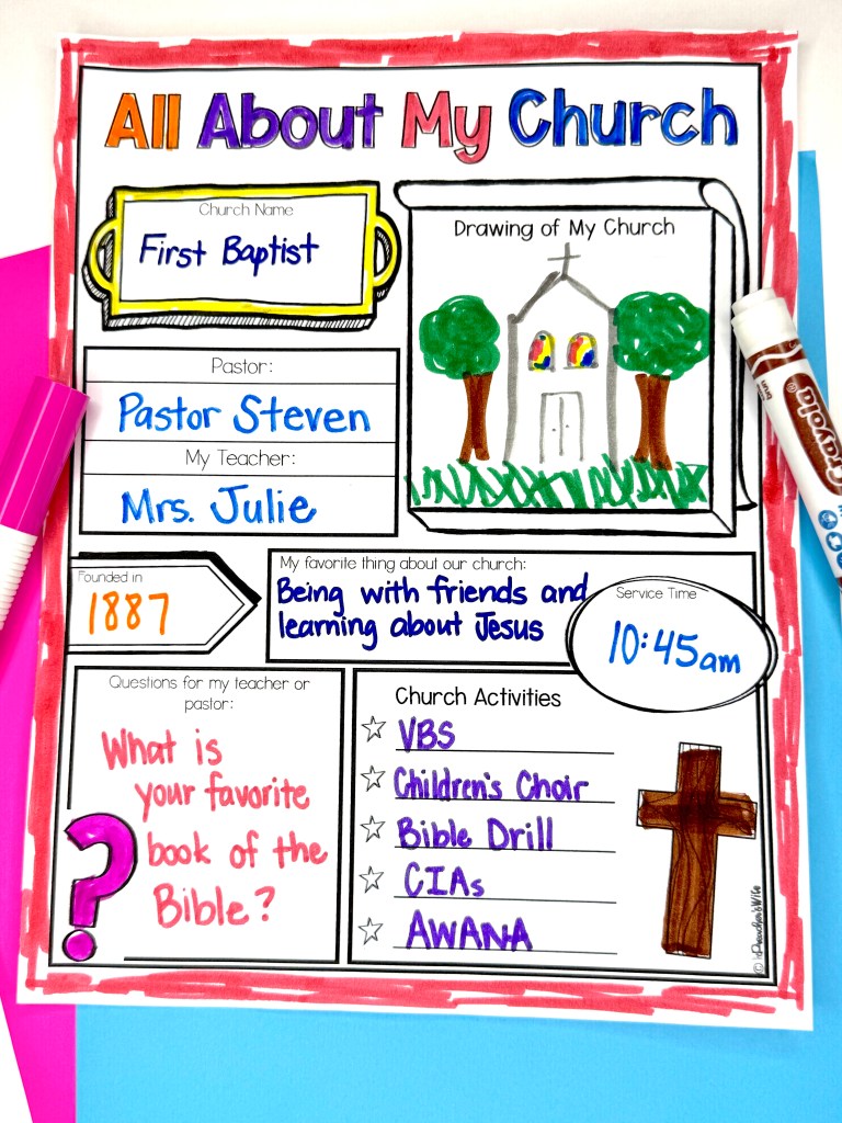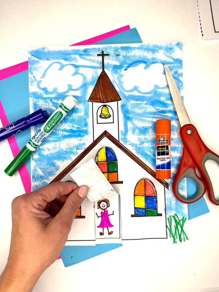 Another fun, low-key activity is this church craft. Kids can color a picture of your church and write fun facts under flaps on the doors and windows. This also makes a great first-day bulletin board display!